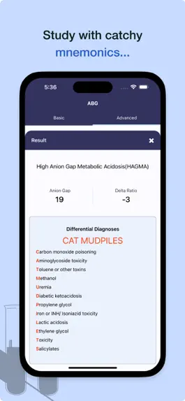 The Arterial Blood Gas Interpreter is intended to assist medics with interpreting blood gas results. It calculates the delta ratio and anion gap and offers possible differential diagnoses based on the results. In addition, it contains useful tips and explanations to help healthcare professionals understand how blood gas results are interpreted.