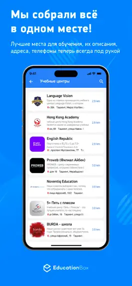 EducationBox - это незаменимый инструмент для тех, кто ищет качественное образование в Узбекистане. Будь то высшее образование, дополнительные курсы или школы для ваших детей, приложение поможет вам найти нужное учреждение и получить максимальную информацию о нем.