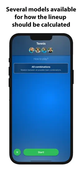 The app is adapted for groups of 2-6 people who regularly play some form of racket sport on one single court. The aim is for all players (or teams) to meet each other in a random order. Match results are entered into the app and win and loss statistics are presented.