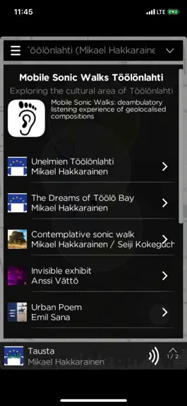 Mobile Sonic Walks proposes a deambulatory listening experience of musical compositions created for and diffused in a chosen site through geolocalisation by the students of the Centre for Music and Technology of the Sibelius Academy at the Uniarts Helsinki. Wandering around in the area you explore the sonic walks with your headphones and mobile phone.