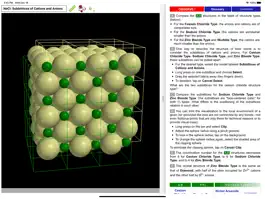 All models can be inspected at any orientation and zoom level and with a choice of the drawing radius for the ionic spheres. For any given ion, a “clipping sphere” can be defined that highlights the local surroundings of that ion and hides the remaining structure. Distances between ions can be measured, and a display of ionic charge labels is available. A glossary, comments section, and set of multiple choice questions (with randomized options) are also included.
