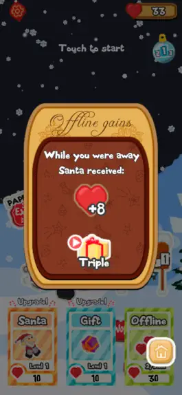 Improve Santa’s strength and gift level so it could fly a longer distance helping you to beat your own record or someone else’s.