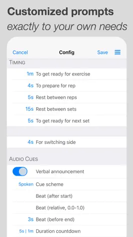 • Progress counting and count-down during a repetition can now be given by a simple tone, rather than by spoken counts; and for those short but tough positions, you can now have a progress count every second.