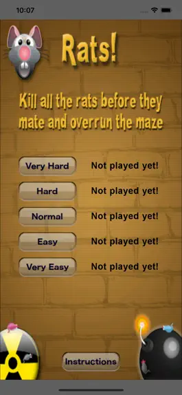 Rats! is a frantic game of rodent extermination. You must kill all the rats before they have a chance to mate and overrun the maze. To do this you can use bombs, radioactive waste, gas, poison, death rats, blocks, and gender changing chemicals.