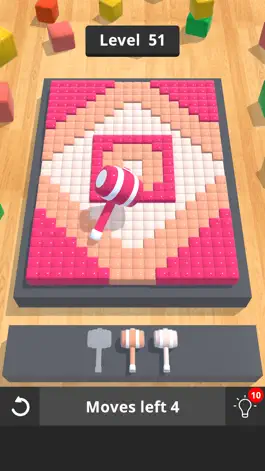 Каждый уровень игры содержит кубики от трех до семи разных цветов. Используйте раскрашивающий молоток выбранного вами цвета и ударяйте им по группе кубиков одного цвета, чтобы применить цвет молотка к группе кубиков. Ваша цель состоит в том, чтобы продолжать менять цвета кубиков, пока не получите только один цвет на доске. Каждый уровень будет иметь ограниченное количество ходов, за которые вы должны решить головоломку. Уровни очень быстро заканчиваются, так что вы можете играть в них в самый маленький перерыв, доступный вам в вашем самом напряженном графике. Наслаждайтесь вызовами Royale Flush и особенно приятными для глаз взаимодействиями между милыми маленькими молоточками и королевскими кубиками.