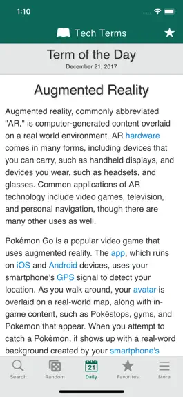 The goal of the Tech Terms dictionary is to make computer terminology easy to understand. Definitions are written clearly and concisely and often provide real-life examples of how the terms are used. You can search and browse through the entire dictionary, save favorites, and come back each day to read the daily definition.