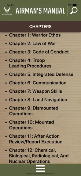 The U.S Air Force Airman's Manual mobile application includes 24 chapters of U.S. Air Force applicable information, ability to bookmark chapters and highlight text, as well as access to Quick Reaction Checklist, U.S.A.F. doctrine and videos. This application also allows the Airman to provide feedback.
