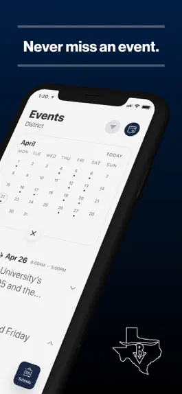 The event section shows a list of events throughout the district. Users can add an event to their calendar to share the event with friends and family with one tap.