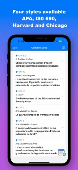 With Citations Styles you can obtain and organize the data of books, chapters and articles from scientific journals (printed and online) automatically through the ISSB or the DOI or enter them manually. We offer you four reference styles so that, depending on your academic field, you can select how to cite and organize your bibliography, changing the style whenever you want. You will also have the possibility of entering personalized notes on each of the documents, tag and filtering them, thus facilitating the preparation of academic papers, books or research articles.