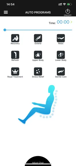 The Orbit 3D App connects wirelessly to your Orbit 3D massage chair using Bluetooth. Use the app to access the controls, including activating manual and automatic massage programs, targeting massage to different parts of your body, or varying the massage type and intensity.