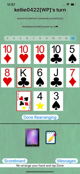 For melding cards, you can now multi-select the cards you want to meld and complete the meld by drawing a line through the cards you want to meld together. First tap the Meld Cards button, then draw a line starting outside of the cards. When you end your line, the meld will be attempted with the cards that you touched. The old method for selecting each card individually for melds is also still available.