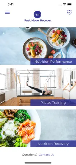 The FMR mobile app integrates Nutrition and Pilates to assist in Performance, Recovery and Injury Prevention.Once the user creates an account you will have access to 3 core components: