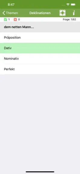 You choose the type of quiz. Learn specifically declensions, tenses or word grammar. For more variety you choose, and the questions are randomly mixed. Also a multiplayer is now integrated. So you can compete against each other for two!