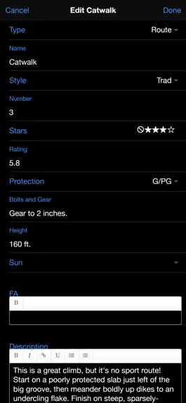 Authoring a rock climbing guidebook has never been this easy. Record details, take photos, draw lines, and collect GPS coordinates while at the crag. Compile the information in a What-You-See-Is-What-You-Get format, and easily update it as projects get sent or holds break. Both light and dark modes are supported automatically, based on your device's setting.