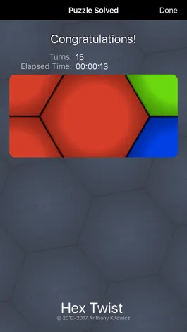 Hex Twist is a puzzle where you need to arrange the colors by tapping hexes. When you tap a surrounded hex, the 6 surrounding hexes spin to the left by one position. As soon as the colors are arranged the same as displayed in the Solved window then you have won.