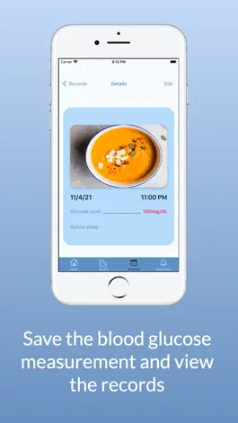 In a quick and easy way, you can save the value of your blood glucose measurement directly on the home page of the app. You can also add a photo and notes for a more complete record.