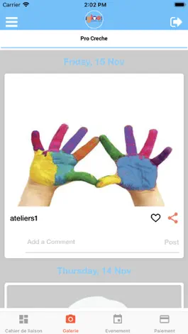 Vous serez informés des principales activités : les messages importants, le programme pédagogique, l’évolution de votre enfant, les moments forts (photos, activités pédagogiques,…), les événements à venir (sorties pédagogiques, carnaval, vacances scolaires,…), le menu cantine, notre règlement interne, et même des informations pédagogiques qui vous permettront de mieux appréhender l’univers de la crèche et de la petite enfance.