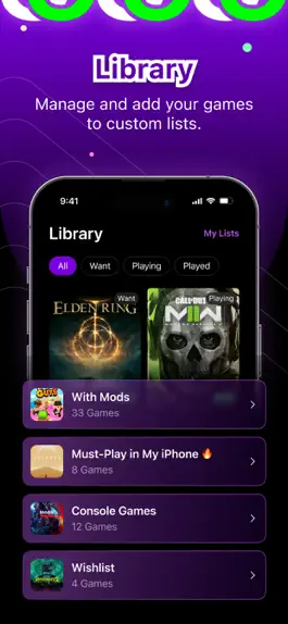 Keep track of your games by adding them to the library and organizing them using customized lists.