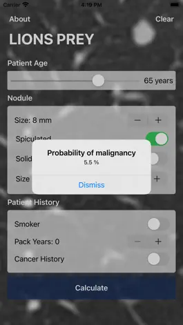 Disclaimer: This software is used as an educational tool to estimate chances of cancer in lung nodules. This is not designed to recommend medical treatment of any kind. Any treatment or observation of this or any other medical condition should only be made after discussions between the patient and their healthcare providers.