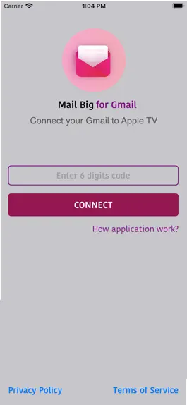 - Open 'Mail Big for Gmail' Apple TV App and tap ‘Connect to Gmail’ and you will see 6-digit Authentication Code.
