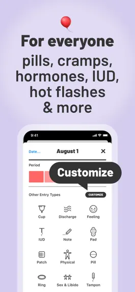 Use Period to track all the things: menstrual flow, cycle length, tampon, pad, cup, discharge, feeling, physical (including cramps and hot flash), sex & libido, hormone (estrogen, progesterone, and testosterone), temperature, weight, test (either ovulation or pregnancy), pill, ring, patch, IUD, birth control implant, and injection. You can even take notes.