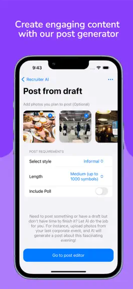 But that's not all! Recruiter AI also allows you to generate personalized LinkedIn posts based on photos and requirements, making it easier than ever to attract top talent to your organization. With our powerful AI technology, you can create messages that speak directly to each candidate's skills and interests, increasing the chances of a successful hire.