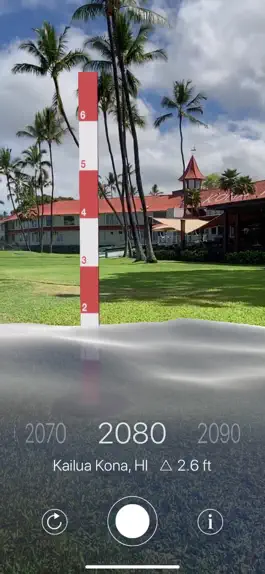 Whenever you're near an ocean or bay, point your mobile device towards the ground. An augmented reality (AR) simulation with animated water and a measuring pole will be displayed, indicating future sea levels at your location (in feet). You can capture and share what you see in a video loop through social media. If your area won't be affected any time before 2100, an "All dry here..." signpost will appear, giving you options to view sea levels at other destinations.