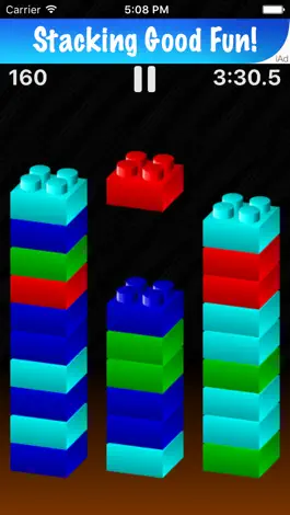 Stacks Away is an easy to learn, fast-action arcade game. The objective is to keep growing stacks of colored pieces from reaching the top of the screen. You do this by arranging pieces of the same color together to make them disappear. Gameplay is simple: touch anywhere on a stack to lift the top piece, drag left or right, then lift your finger to drop the piece on the new stack.