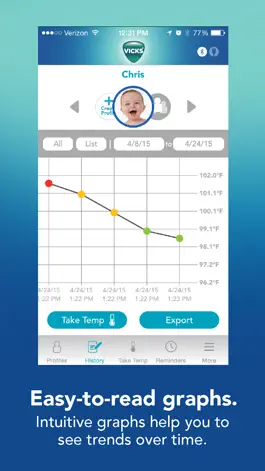 The Vicks® SmartTemp App works with the Vicks® SmartTemp Thermometer to make it easy to take and track temperatures for the entire family.