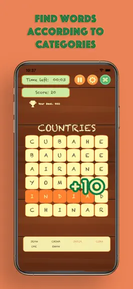 Find words according to categories and get points. The more points you earn, the closer you are to the high score!
