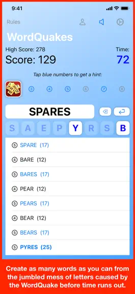 WordQuakes now supports Game Center functionality, allowing you to see how you stand against your friends and other players around the world on leaderboards for the week or for all time. You will also be recognized for your achievements in the game. Additionally, you can issue challenges to other players to try and beat your achievements and scores.