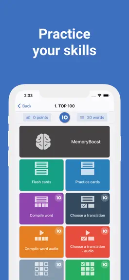 Our unique algorithm improves the learning process, using proven methods from the field of memory research. Words adapts individually to you, selectively repeats the words with which you had problems. Completing lessons and playing games, you will gain experience, move to higher levels and collect rewards.